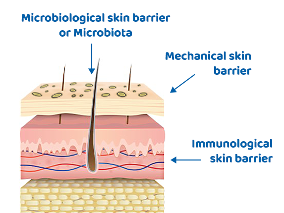 The microbiological skin barrier: there are many microorganism that live on the skin surface (bacteria, yeasts, etc.). This balanced barrier protect from invasion of pathogen microorganisms.