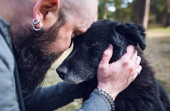 Older dog held by lady owner