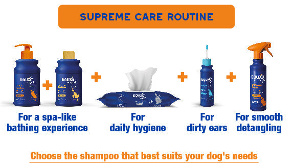 Your dog’s skin is as delicate as a baby’s. That’s why it deserves consistent care with ultra-safe, gentle products. DOUXO® SPA Detangling Spray makes grooming easy by safely detangling knots and nourishing the coat — no rinsing required.