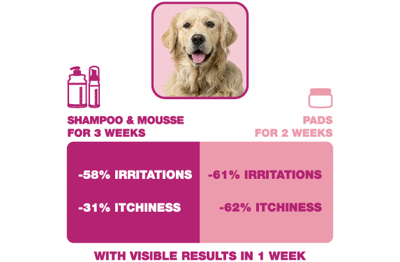 Many external factors can turn your pet’s skin pink, red, irritated. DOUXO® S3 CALM brings quick significant relief to irritated skins.